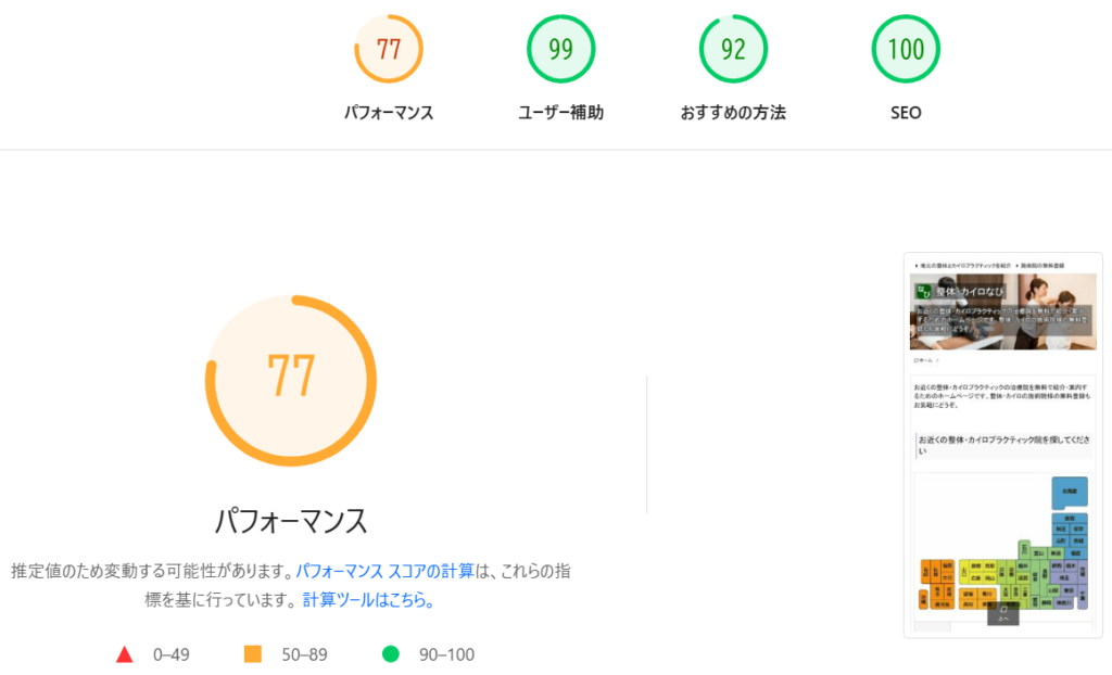 これを使うのが一般的です。たとえば、「整体・カイロなび」トップページの表示速度を測ってみると、77というスコアが出ます。