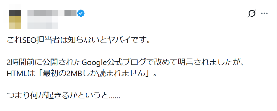 今回の「Google検索のクローラーはHTMLファイルの最初の2MBまでしか読まない」というのは嘘ではありませんが、ほとんどの人には無視して良い情報です。
