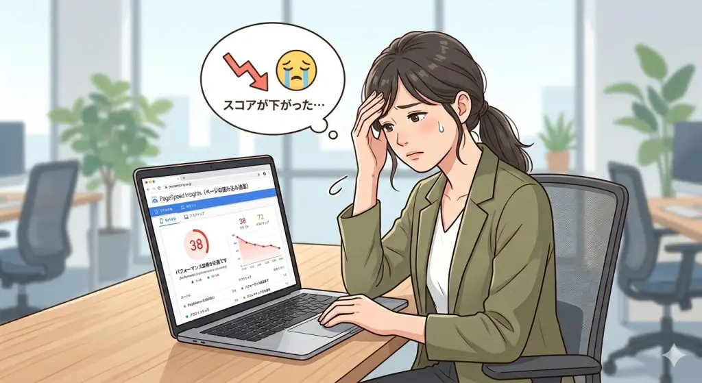 シンタニさんにホームページの表示速度をアップしていただきましたが、PageSpeed Insightsで調べ直したら、ずいぶんスコアが下がっていました。これはいったいどういう事なのでしょうか?